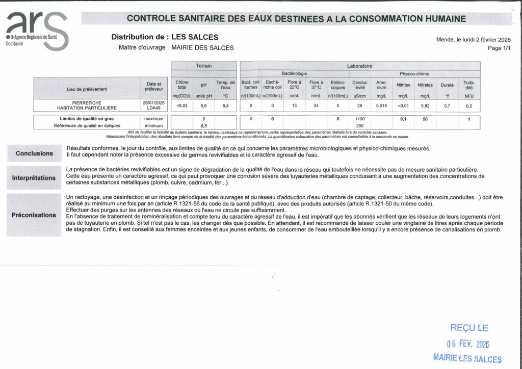 Analyses de l’eau potable : Pierrefiche 2026-02